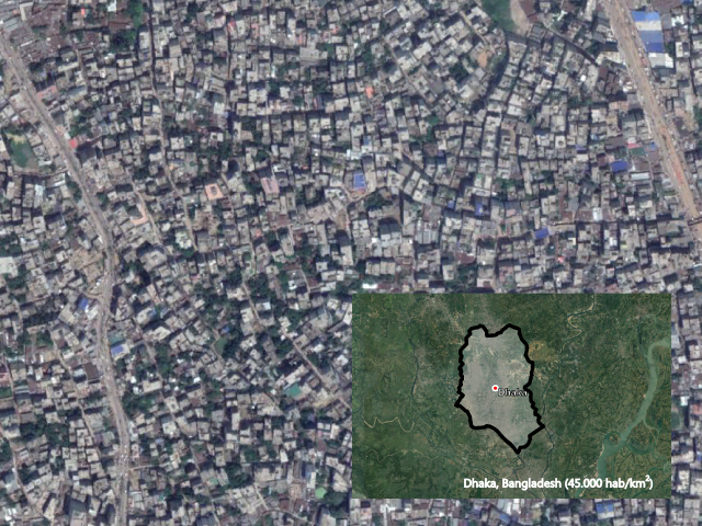 Daca, capital do Bangladesh, tem uma densidade populacional de 45.000 pessoas/km2. Wuhan cidade chinesa capital da província de Hubei, tem uma população de cerca de 11 milhões de pessoas e tem áreas (p.e. Jianghan) em que a densidade é superior a 24.000 pessoas/km2.