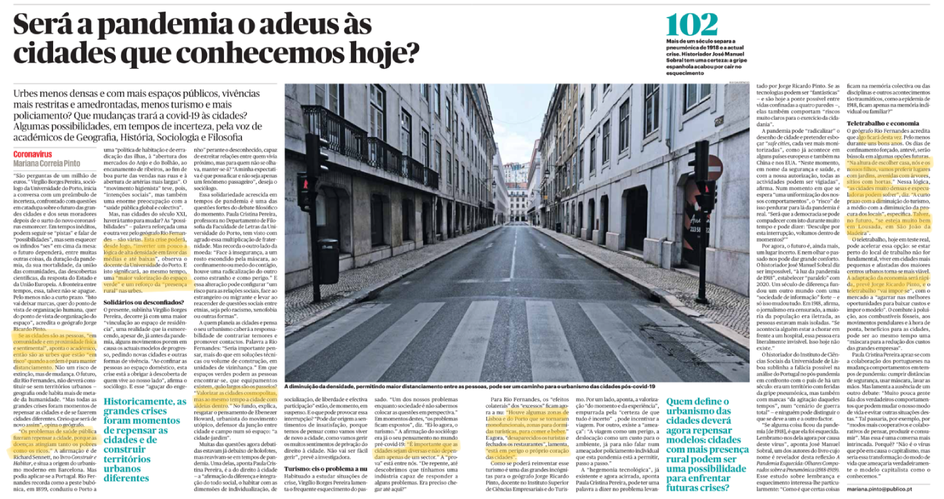 O Público de 13.abr.2020 (pela jornalista Mariana Correira Pinto), publicou um artigo sobre o impacto da pandemia nas cidades tal como as conhecemos e concebemos hoje. É ainda muito cedo para quantificar os impactos, mas há no artigo um conjunto de opiniões interessantes.