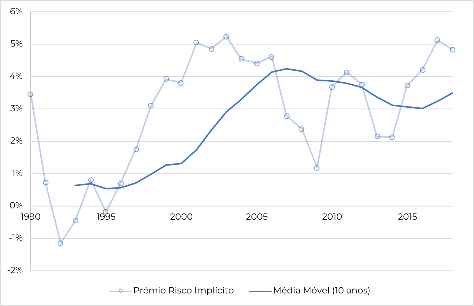 A análise do Gráfico 2 permite ver que o “prémio de risco" implícito na taxa de atualização aumentou significativamente nas últimas décadas, com exceção do período da crise económica que ocorreu entre 2008 e 2012. Neste gráfico está também representada uma “linha de tendência” (azul escura) elaborada a partir na média móvel dos 10 últimos anos.